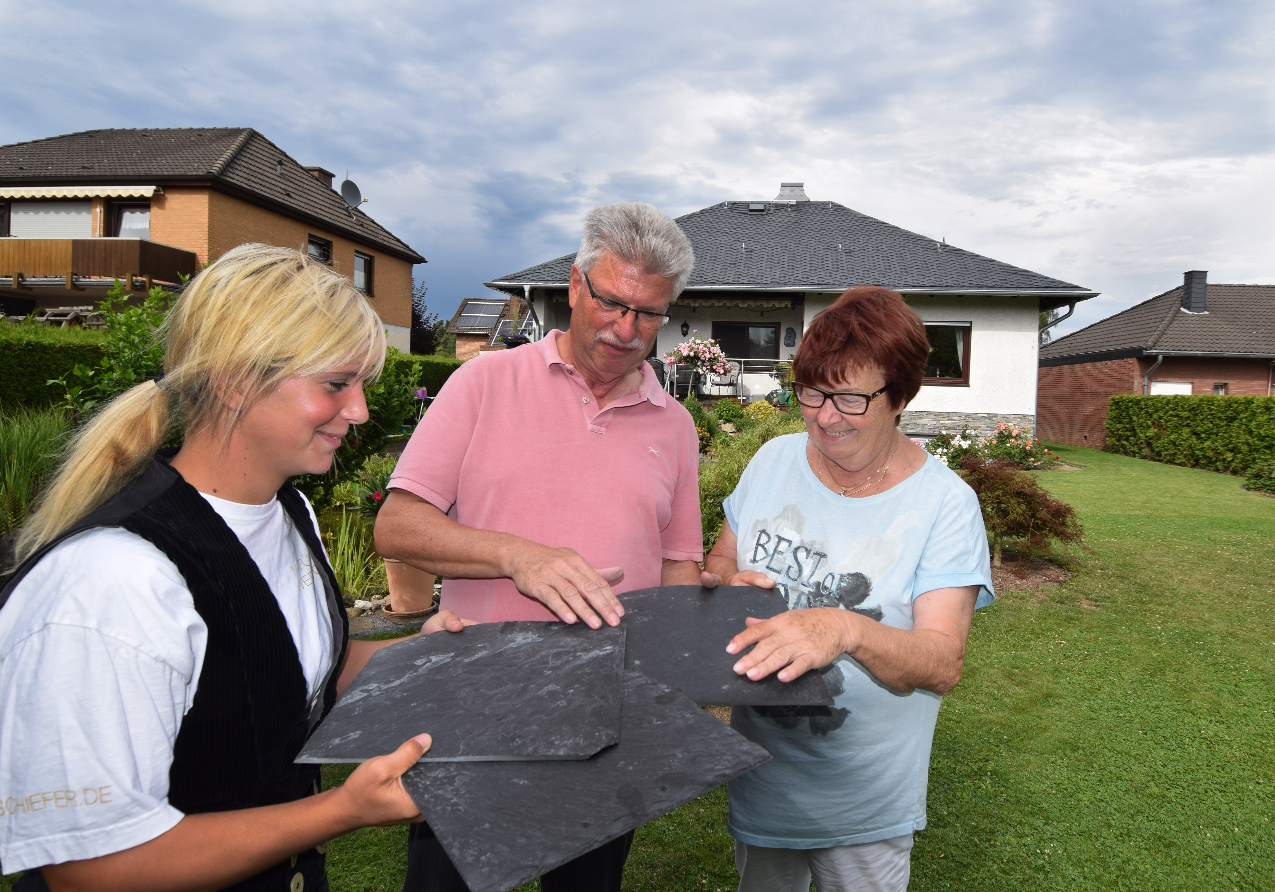 Sicher geschützt leben Gerti und Bernd Schubach jetzt unter einem neuen Schieferdach. Dachdeckermeisterin Sarah Darscheid überzeugte die Bauherren von einer Sanierung mit Schiefer – langlebig, sturmfest und ewig schön.